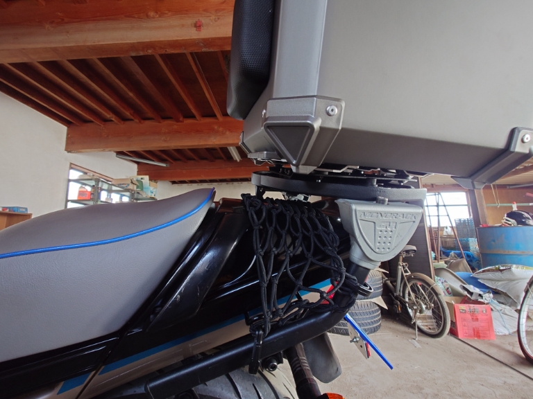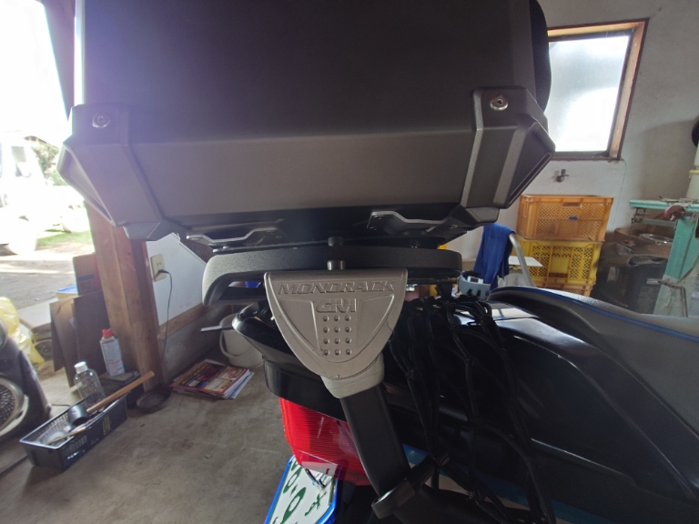 さっそく付けてみよう!と思ったのですが、GIVIしか持ってないので、どうやったら、付けられるかな?とかなり試行錯誤して、GIVIのベースを裏返すと平坦になるので、その上に、ボックスのべースを取り付けてみました。(笑)